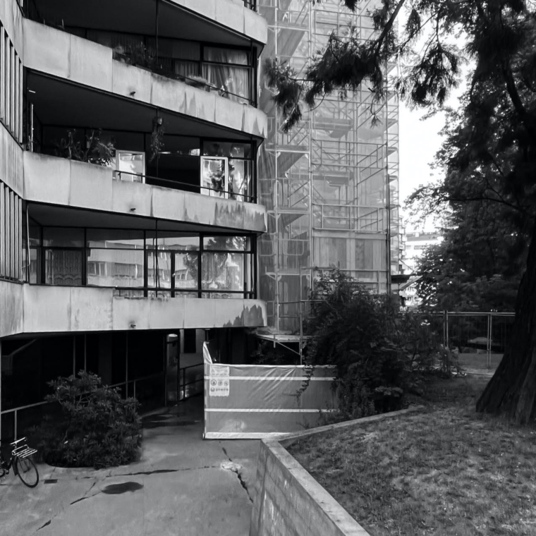 avril 2022 _ ouverture du chantier de la deuxième étape du chantier de restauration de l'immeuble 'miremont-le-crêt' de marc-joseph saugey (1953-1957). réalisation suivie par dcm.