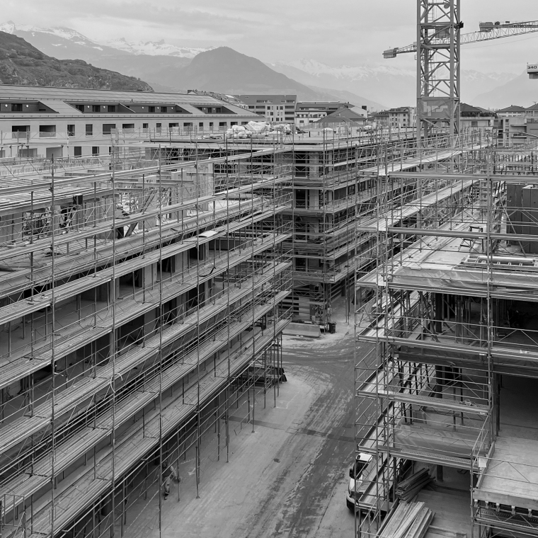 février 2023 _ les 6 immeubles du quartier 'cour de gare' à sion, conçus par maa, sont en voie d'achèvement au niveau du gros œuvre.