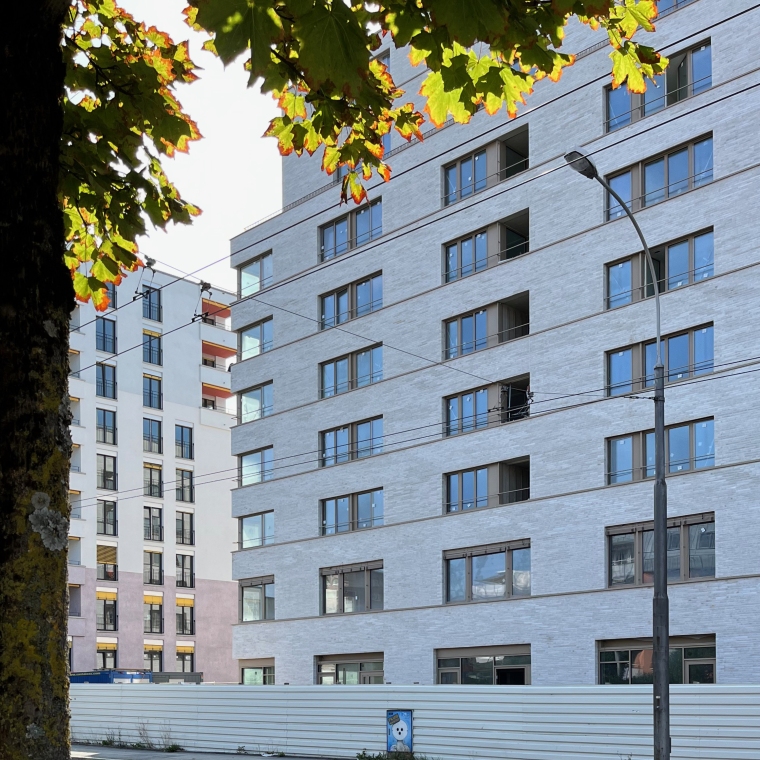 mai 2024 _ la façade de l'immeuble de logements de tête de la pièce urbaine b de l'eco-quartier des plaines-du-loup, à lausanne, se dévoile.
