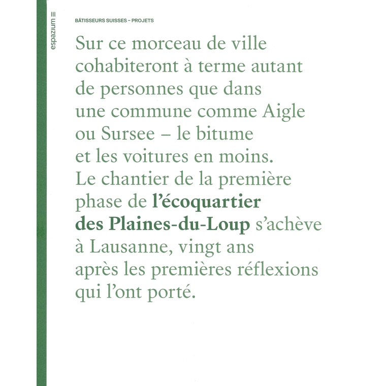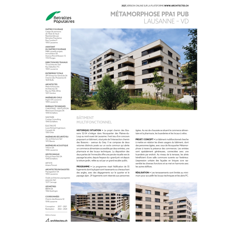 janvier 2025 _ les trois bâtiments livrés par maa dans l'eco-quartier des plaines du loup sont publiés dans le tiré à part 'bâtisseurs suisses' du journal de la sia 'tracés'.