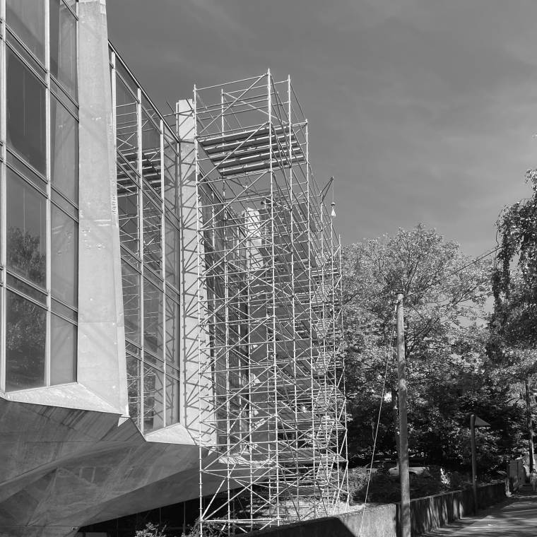 septembre 2024 _ la restauration de la façade de l'immeuble administratif genevois de françois maurice et louis parmelin (1965-1967) se découvre.
