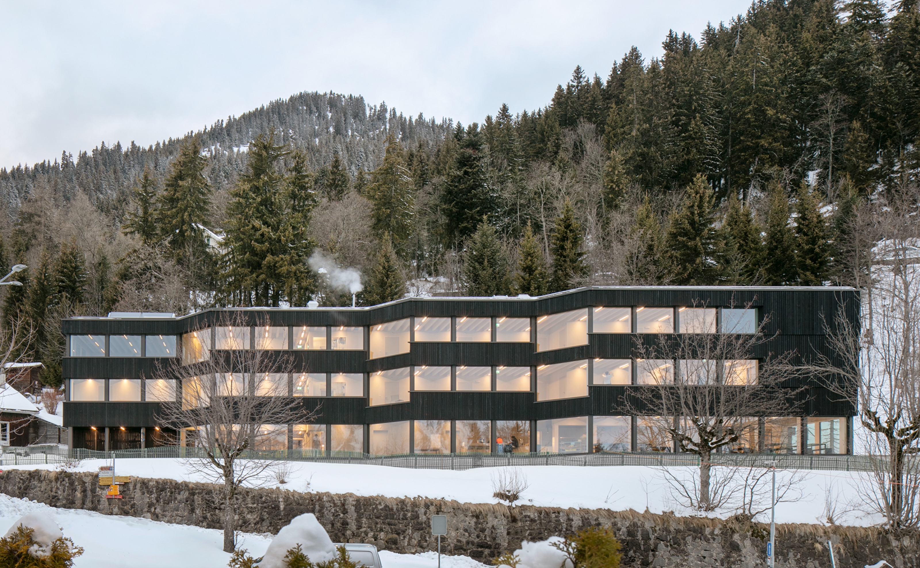 Situé sur les hauts du village de Leysin, dans les Alpes vaudoises, le nouveau centre pédagogique alpin « Les Cabris » zigzague à la lisière d’une forêt de conifères. Il accueille les élèves en camp de ski et les professionnels de l’enseignement pour des formations continues de courte durée dans un cadre singulier.