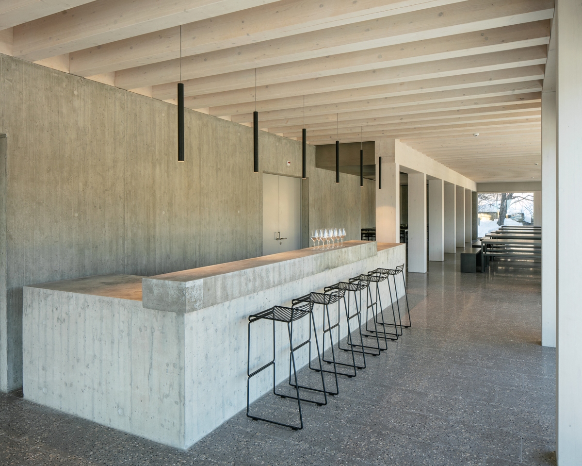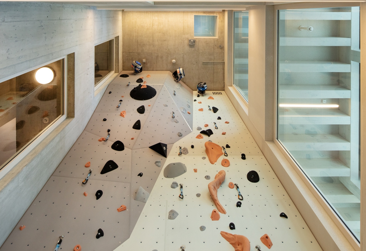 La construction presqu’entièrement en bois se veut rationnelle dans une ambiance (Stimmung) qui s’apparente au refuge de montagne auquel l’époque contemporaine a ajouté quelques éléments de confort hôtelier. La structure apparente est répétitive et scande les espaces par une série de poteaux et de poutres préfabriqués en sapin légèrement lazuré en blanc. L’hybridation de la mise en œuvre en béton dans le socle – pour répondre aux contraintes des charges d’avalanches – et en bois local s’inscrit dans le sens de la transition énergétique.