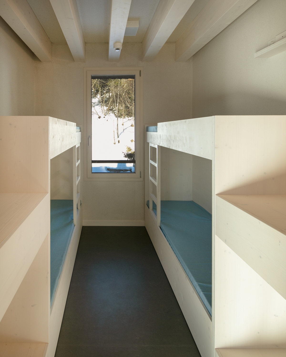 Au Nord, les chambres d’une échelle plus modeste bénéficient de la proximité et du calme de la dense forêt. Dans le dessin précis du mobilier, les jeunes usagers trouvent des commodités permettant de poser et recharger le téléphone portable, de laisser la valise posée ouverte et de dormir dans une couchette qui évoque la mémoire du chalet.