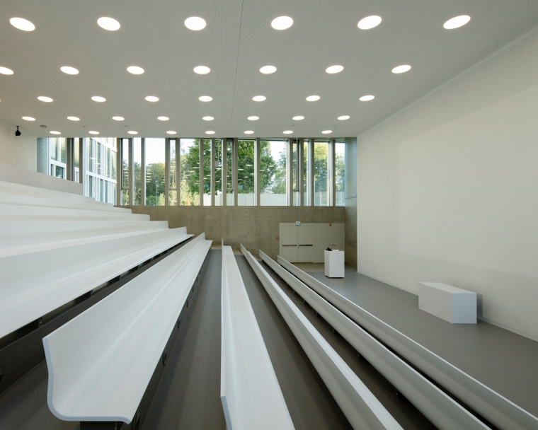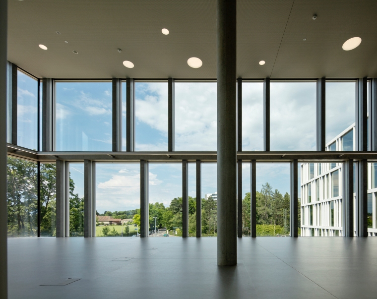 Disposées 'en étoile' autour du cœur distributif, les salles de classes et salles spéciales s’égrainent le long de murs en béton brut apparent, percés de fines césures de lumière. Dans la branche nord-ouest de l’école se situent les éléments programmatiques communs : la cafétéria, la salle des maîtres, la médiathèque (avec un double niveau) et une salle polyvalente.