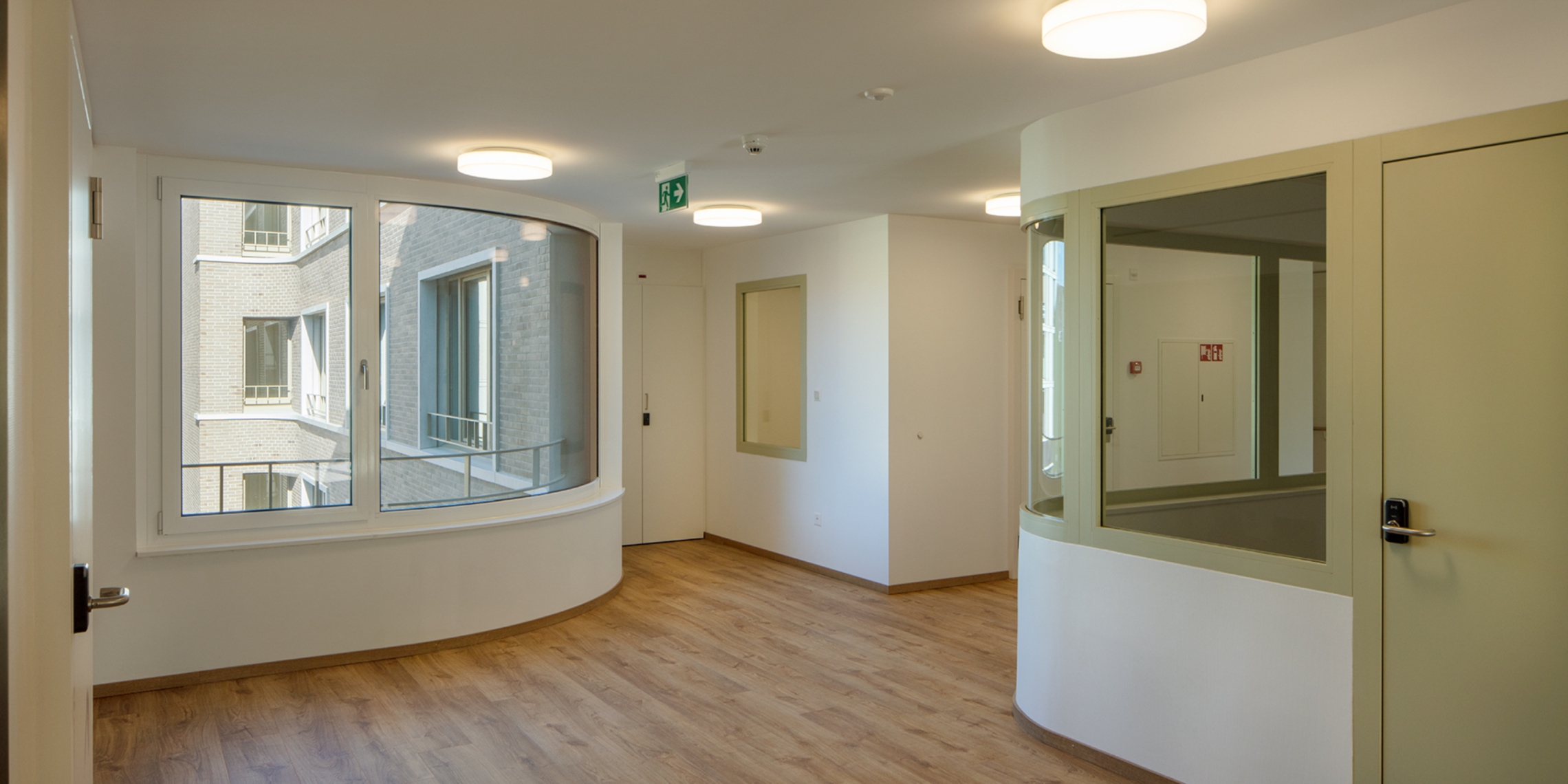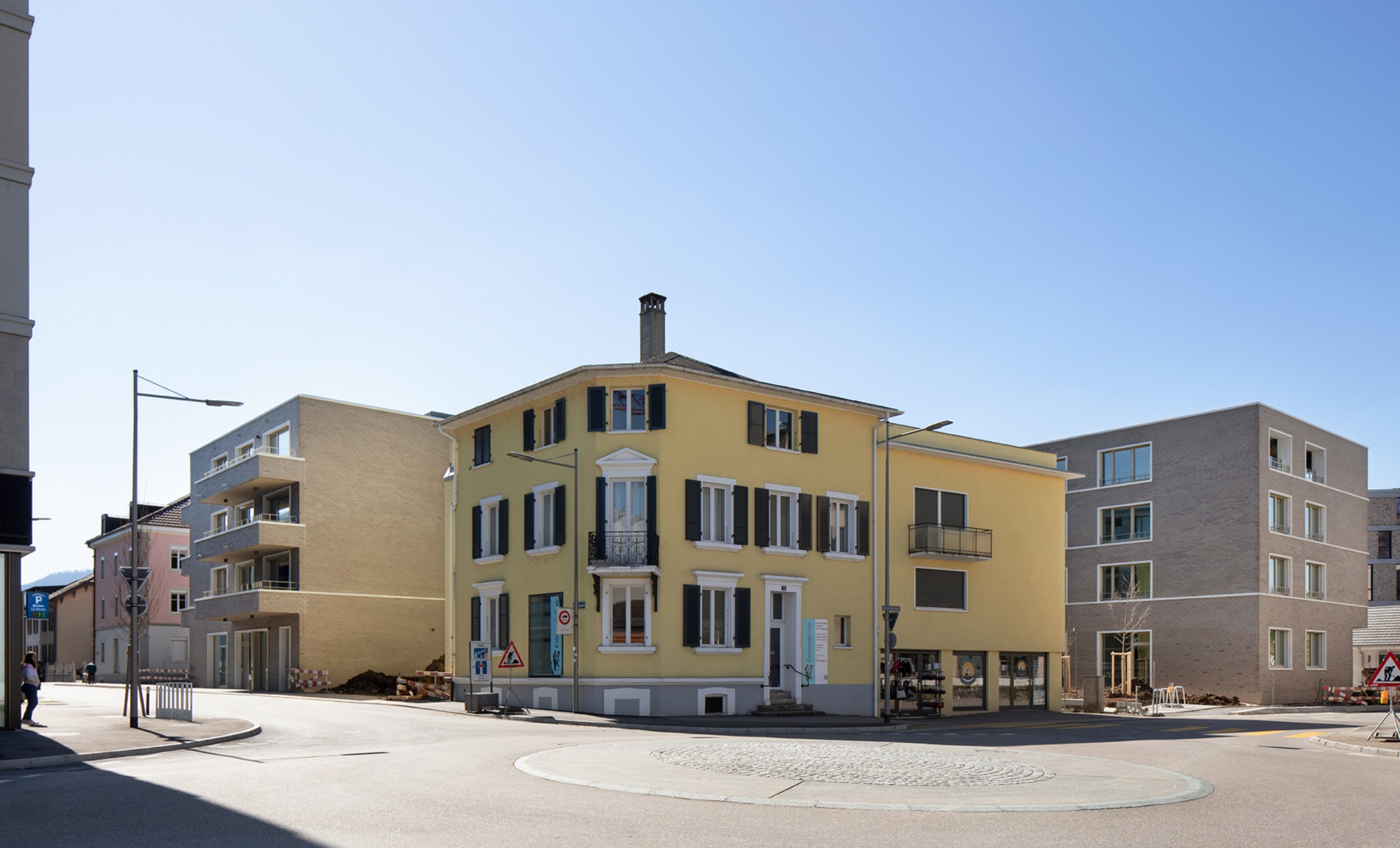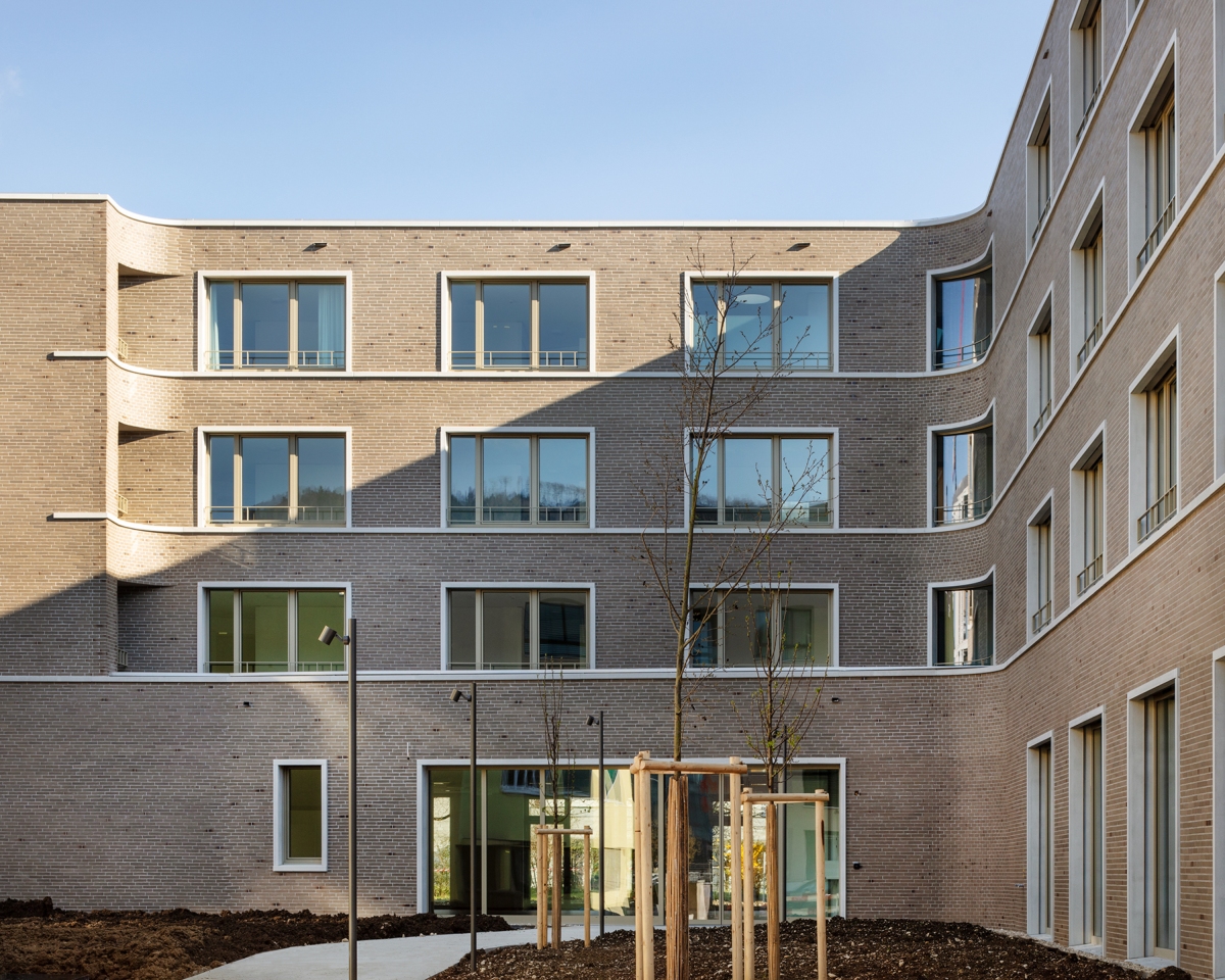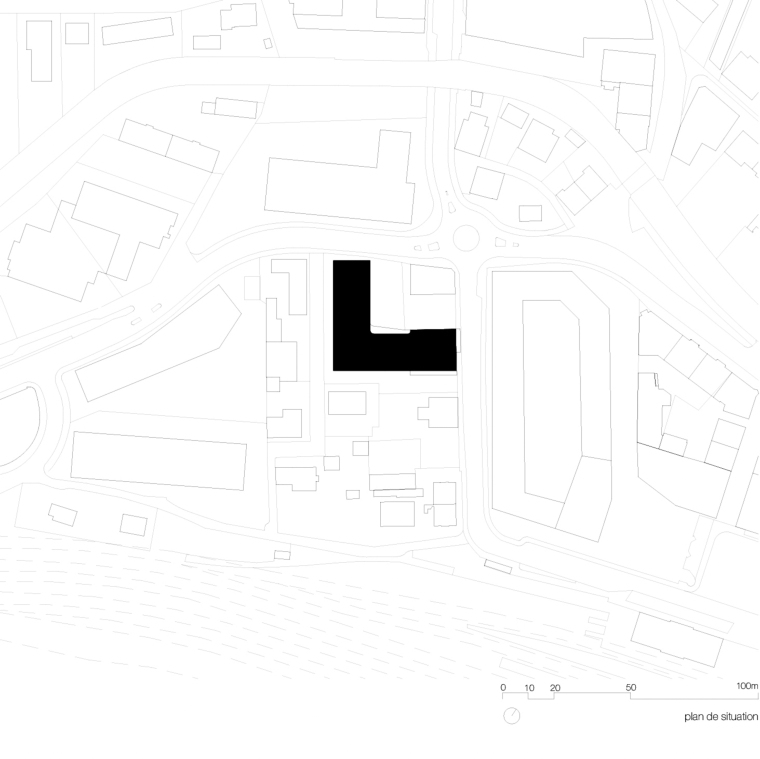 À proximité de la gare de Delémont, le nouvel établis-sement pour personnes âgées « Clair Logis », prend la place d’un bâtiment d’après-guerre dont l’obsolescence thermique, la forte présence d’amiante et une typologie inadaptée à une fonctionnalité contemporaine n’ont pas permis sa réutilisation. En actant une opération de densifi-cation du quartier, le projet prend le parti de préparer une forme urbaine complète, dont la présente réalisation n’est que la première pierre d’un futur édifice à cour et dont les arrondis de la façade intérieure amorcent les contours d’une intériorité en devenir.