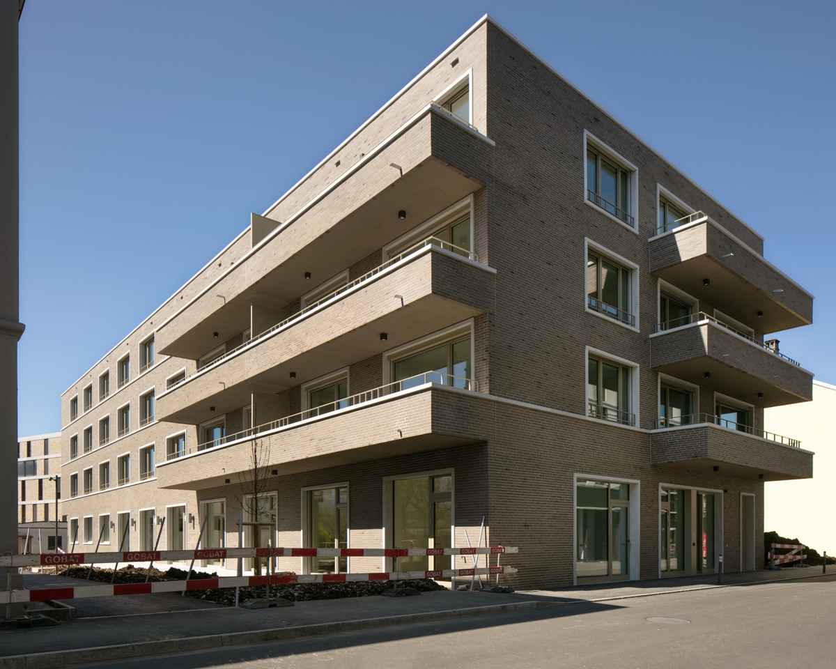 Le choix de la brique de terre cuite s’inscrit dans une certaine histoire de la région, celle qui a vu s’ériger de belles manufactures ou des industries de renom. La physionomie du projet est rendue grâce une mise en œuvre sobre et élégante, employant des détails de cons-truction typiquement liés à la brique : encadrements, tablettes et corniches qui soulignent la texture de la matière riche en vibrations. Ces modénatures sont conju-guées à l’emploi de menuiseries de couleur bronze et de balustrades en métal au dessin raffiné, confirmant ainsi la réinterprétation de modèles.