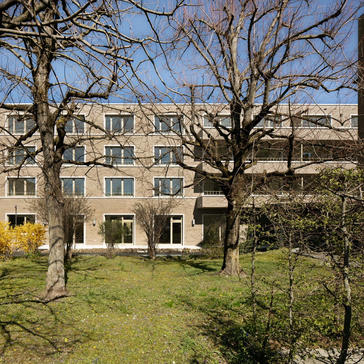 L’entrée principale de l’institution prend place dans le jardin intérieur arboré, alors que l’accès à la cage d’esca-lier des logements s’effectue le long de la rue des Texé-rans, sous des balcons qui formalisent la présence domestique.