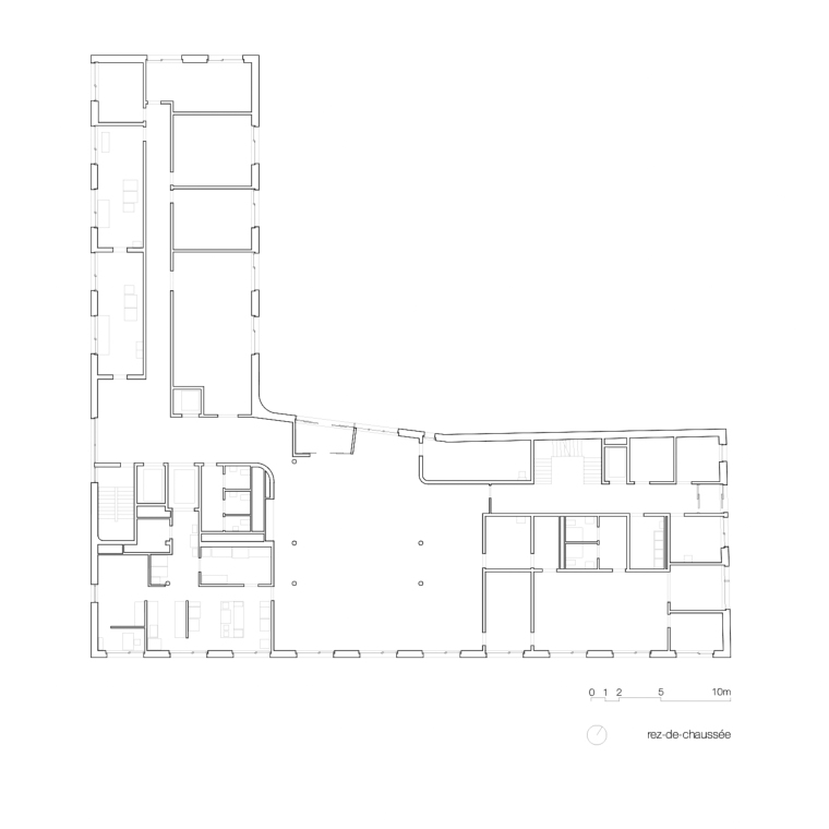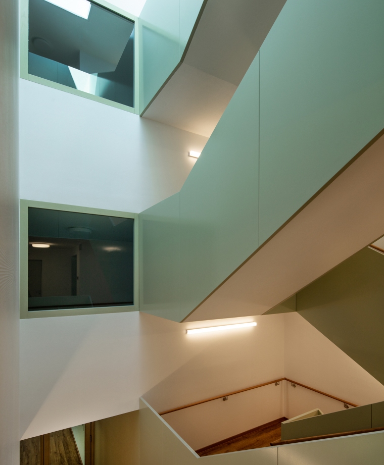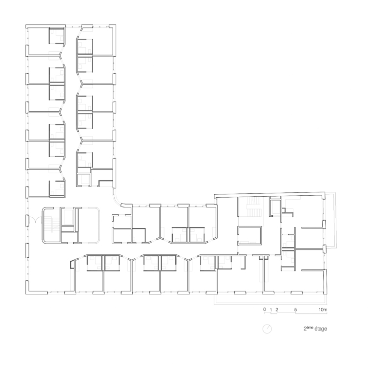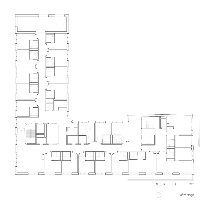 La typologie du plan renvoie au lieu par l’inscription d’une distribution par couloir central dont la morphologie pliée anime les parcours et par la valorisation de l’angle pour y inscrire les espaces communs à chaque niveau.