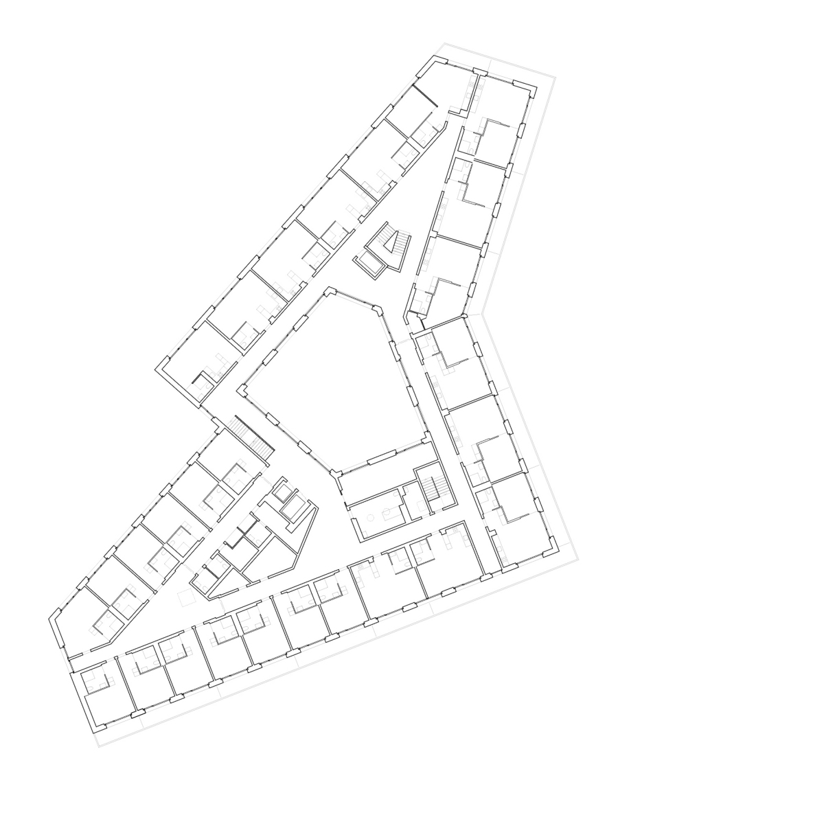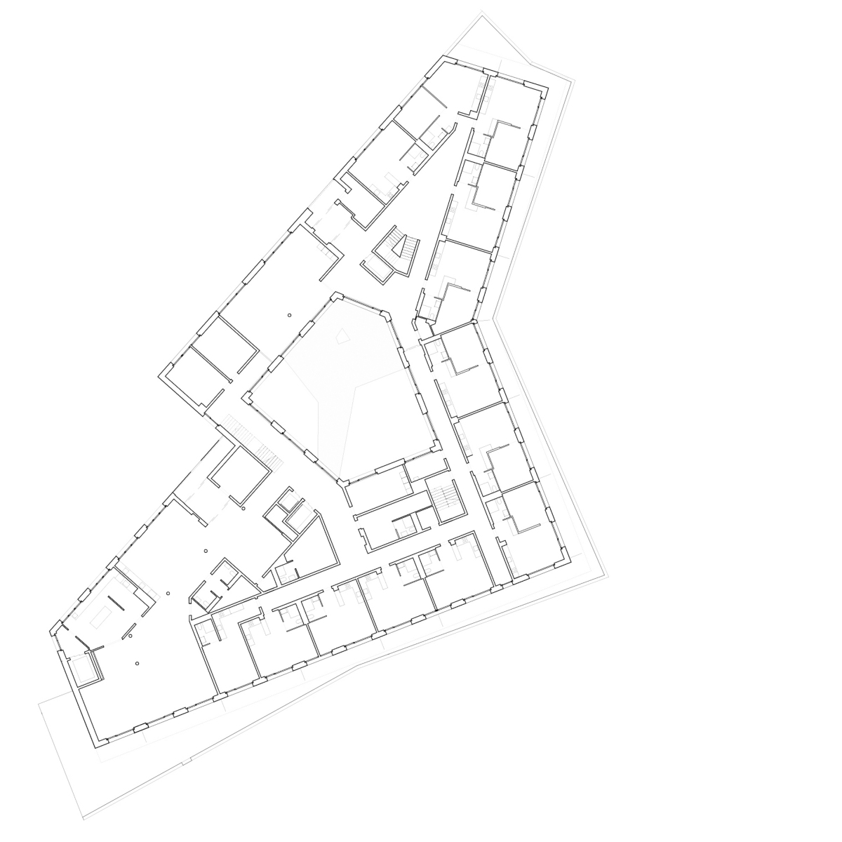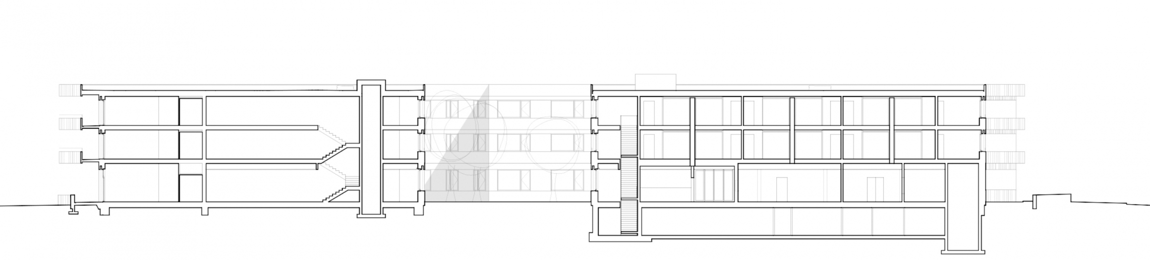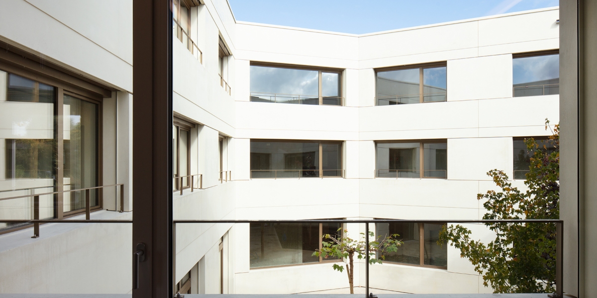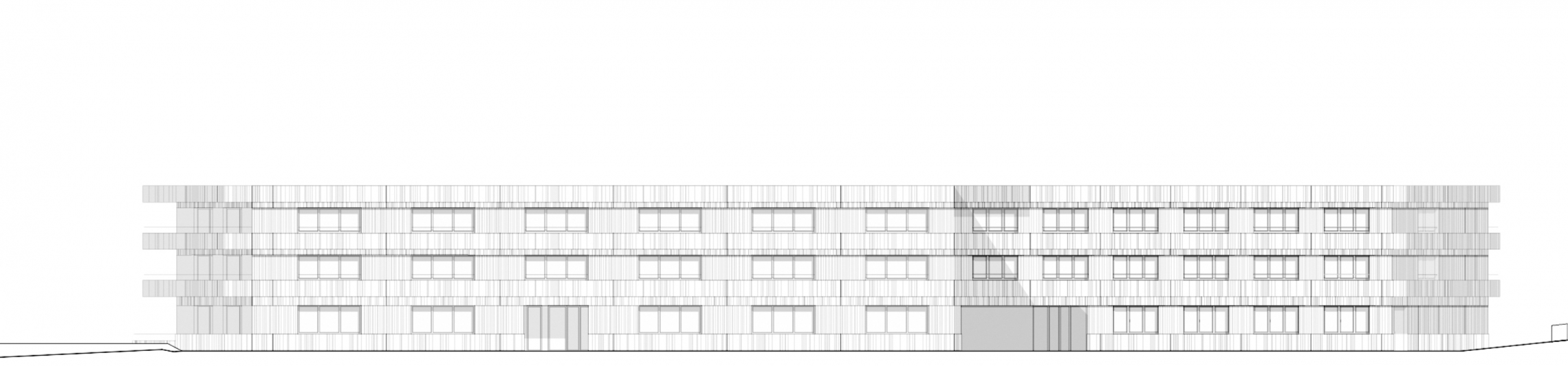 Niché au creux d’un méandre de la Sorne, le bâtiment se plie pour épouser les contours de l’environnement : le long de la rivière de larges terrasses s’ouvrent sur le monde végétal induit par l’hydrologie ; au nord le volume de faible gabarit s’inscrit dans la continuité du paysage bâti existant. Au cœur de cette forme hybride s’installe une cour ouverte à destination des aînés de l’institution. Les distributions horizontales bénéficient de l’apport de lumière de cette centralité et permet des parcours de qualité pour rejoindre son espace privé domestique, tout en faisant office de lieu de référence et de repérage.