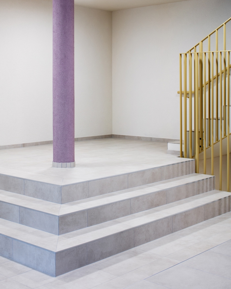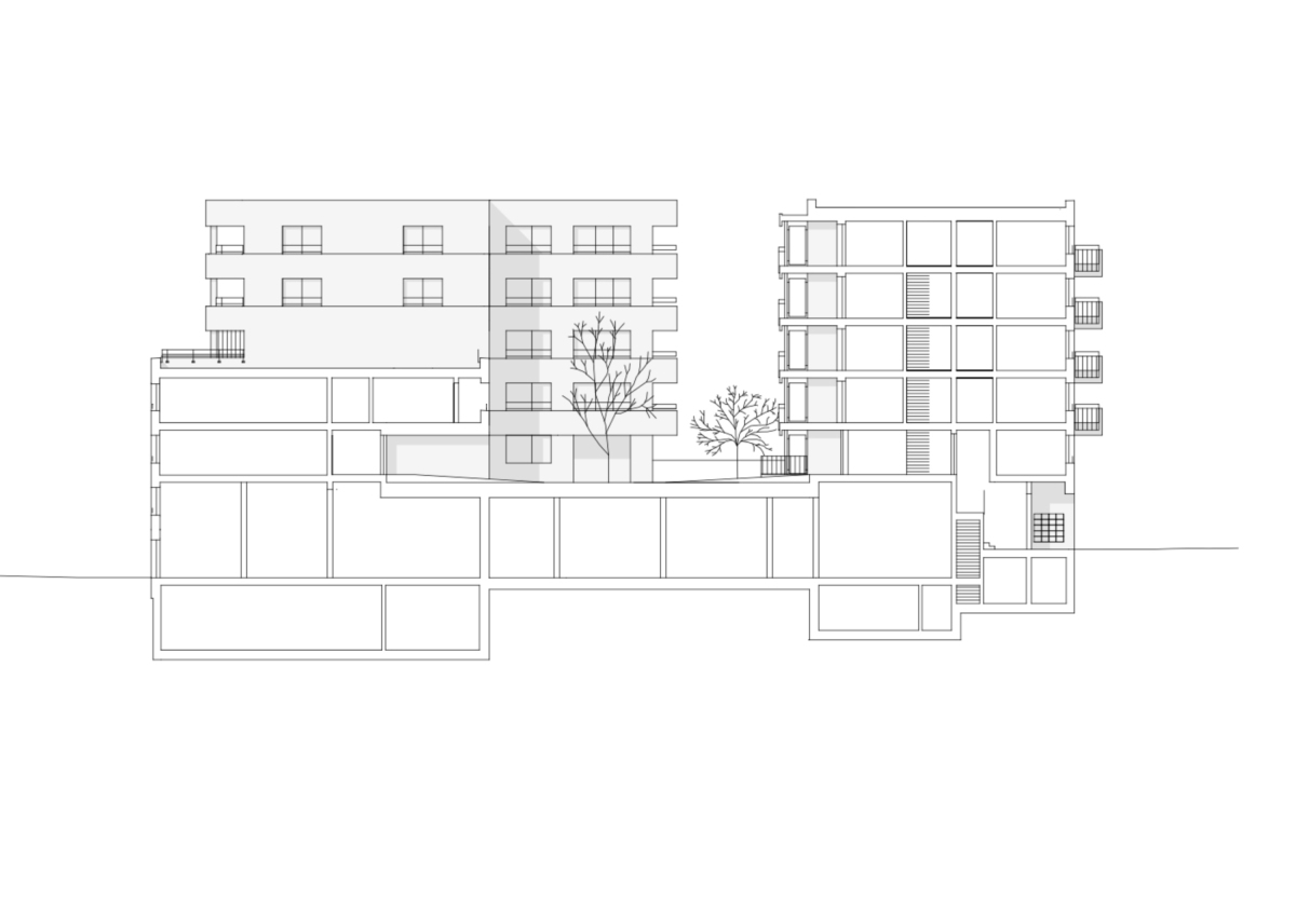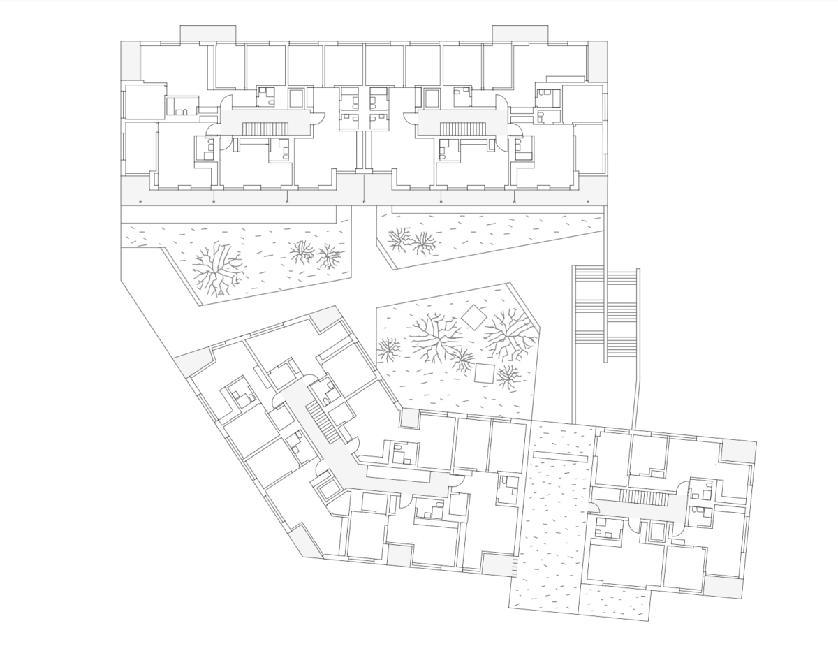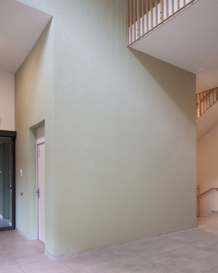 Aux étages, les deux types d’habitat sont clairement dissociés autour du jardin suspendu, lequel est relié avec le sol naturel par un grand escalier. Au nord, l’immeuble rectiligne accueille des appartements traversants et sur les angles, offrant des vues lointaines sur l’environnement. Le hall s’inscrit dans une coupe qui permet de relier la voie de desserte au jardin intérieur. Dans les logements destinés aux seniors, l’entrée en double hauteur relie également la rue à la terrasse, espace de délassement au bénéfice des usagers. La salle commune y trouve un emplacement stratégique. Au-dessus, les logements s’égrainent autour d’une longue cage d’escaliers dont la forme pliée offre des jeux d’ombre et de lumière.
