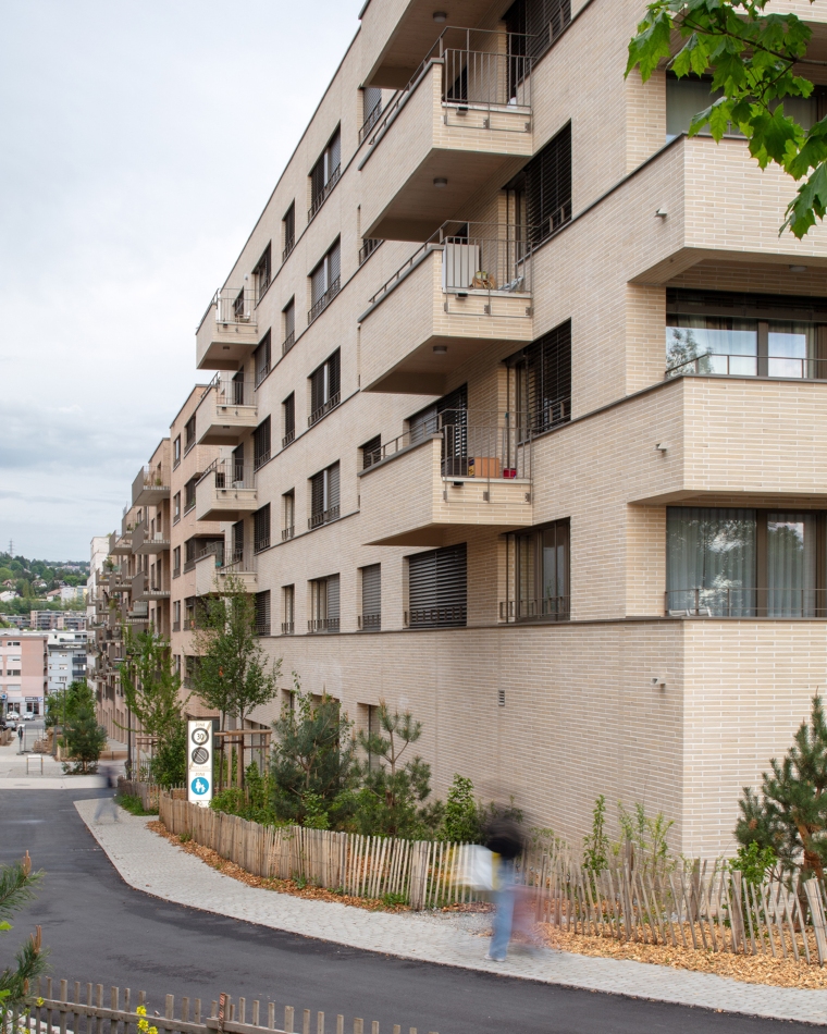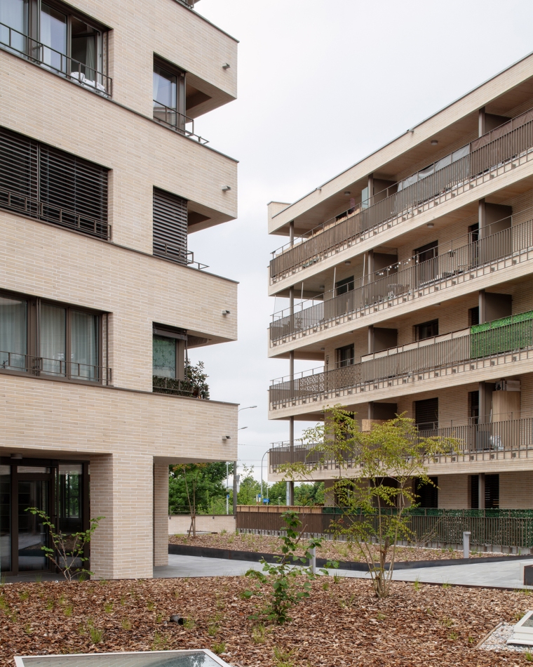 L’expression des façades se met en syntonie avec les autres édifices de la pièce urbaine : des terrasses continues, des balcons, des garde-corps en serrurerie ou un revêtement en brique cherchent des parentés avec les immeubles voisins. La matérialité intérieure revêt un caractère domestique avec un crépi coloré dans les espaces communs et la présence de bois naturel dans les plafonds des logements. L’ensemble bâti répond aux critères stricts d’un éco-quartier durable.