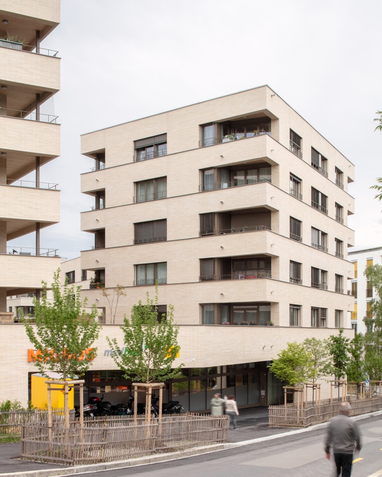 Le bâtiment situé à l’ouest de la pièce urbaine « B » se compose de deux volumes posés distincts, sur un socle. L’ensemble réalisé s’inscrit dans la silhouette du quartier qui cherche à reproduire une courbe dont le centre est plus bas que les extrémités. La disposition des immeubles offre une percée visuelle depuis l’espace semi-public situé sur la toiture-jardin, vers le grand paysage lacustre.
