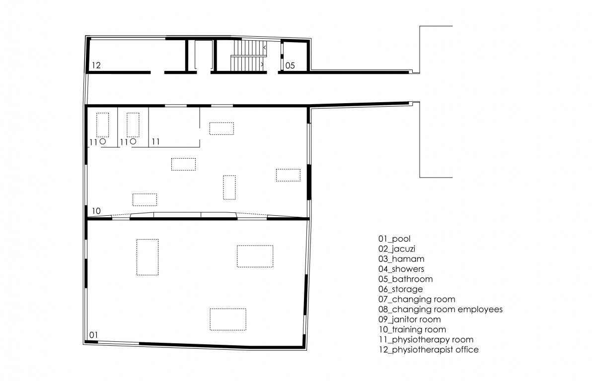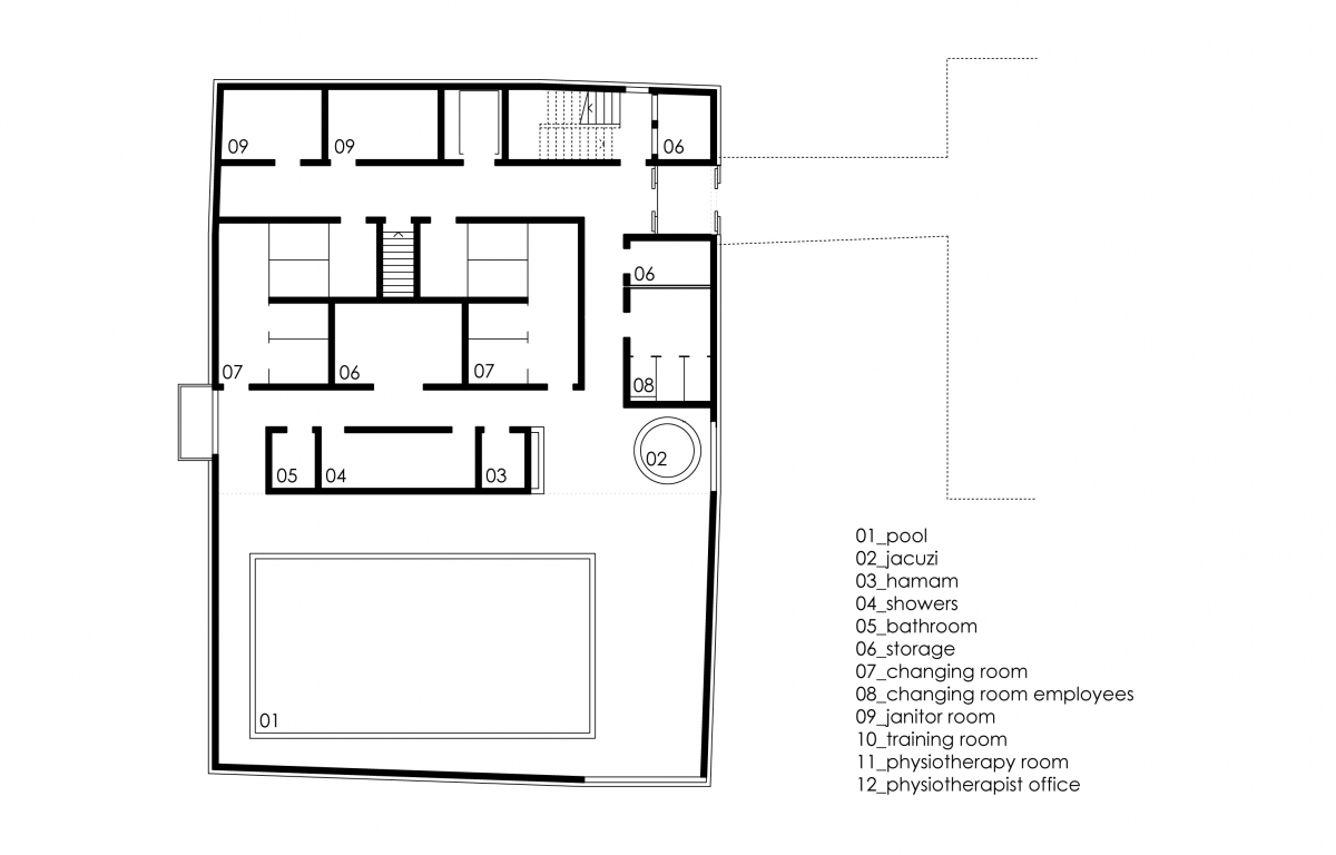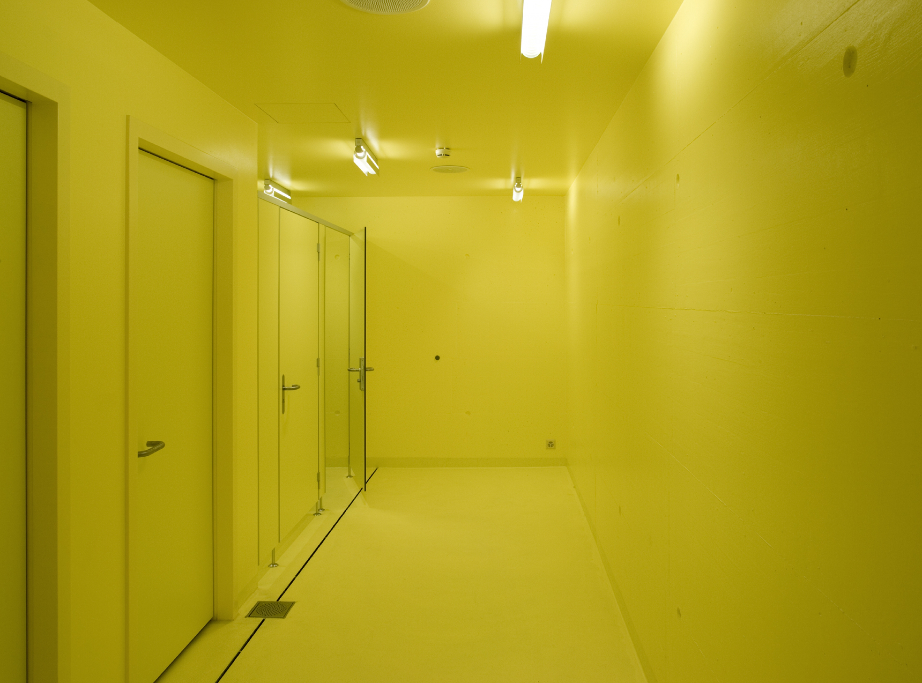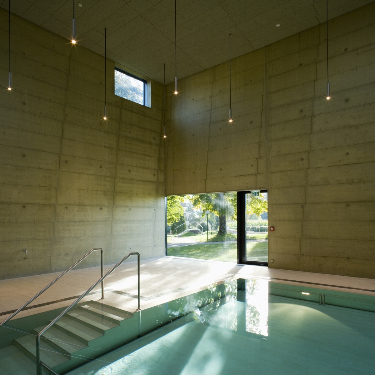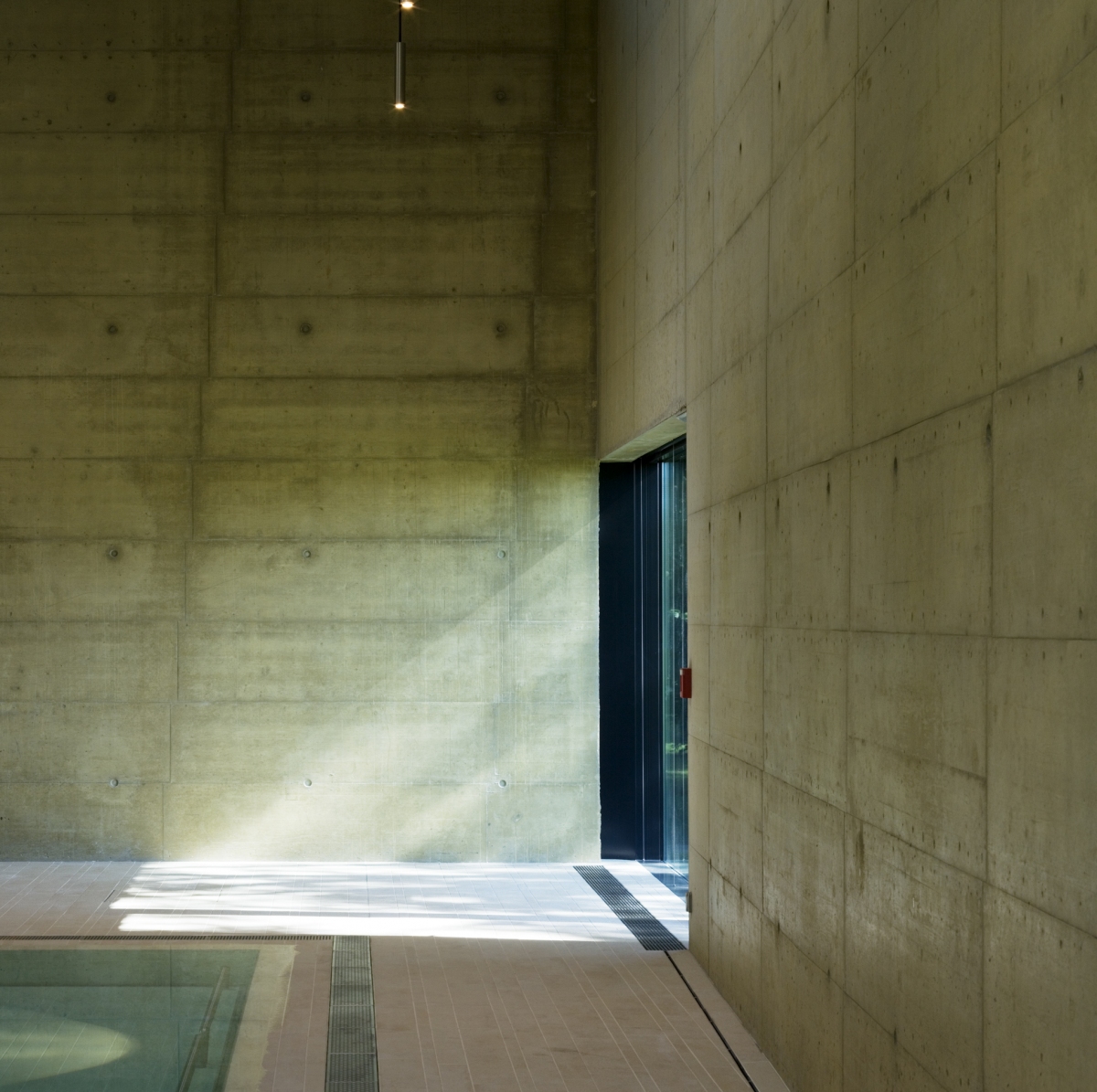 La piscine, réalisée sur une double hauteur, se met en rapport avec le paysage par quelques grandes fenêtres formant des cadrages, par des ouvertures sur le ciel et par des fenêtres intérieures en relation avec l’étage. L’utilisation d’un béton teinté et calepiné précisément confère à l’espace intérieur de cette pièce d’eau, une matérialité et une texture particulière.