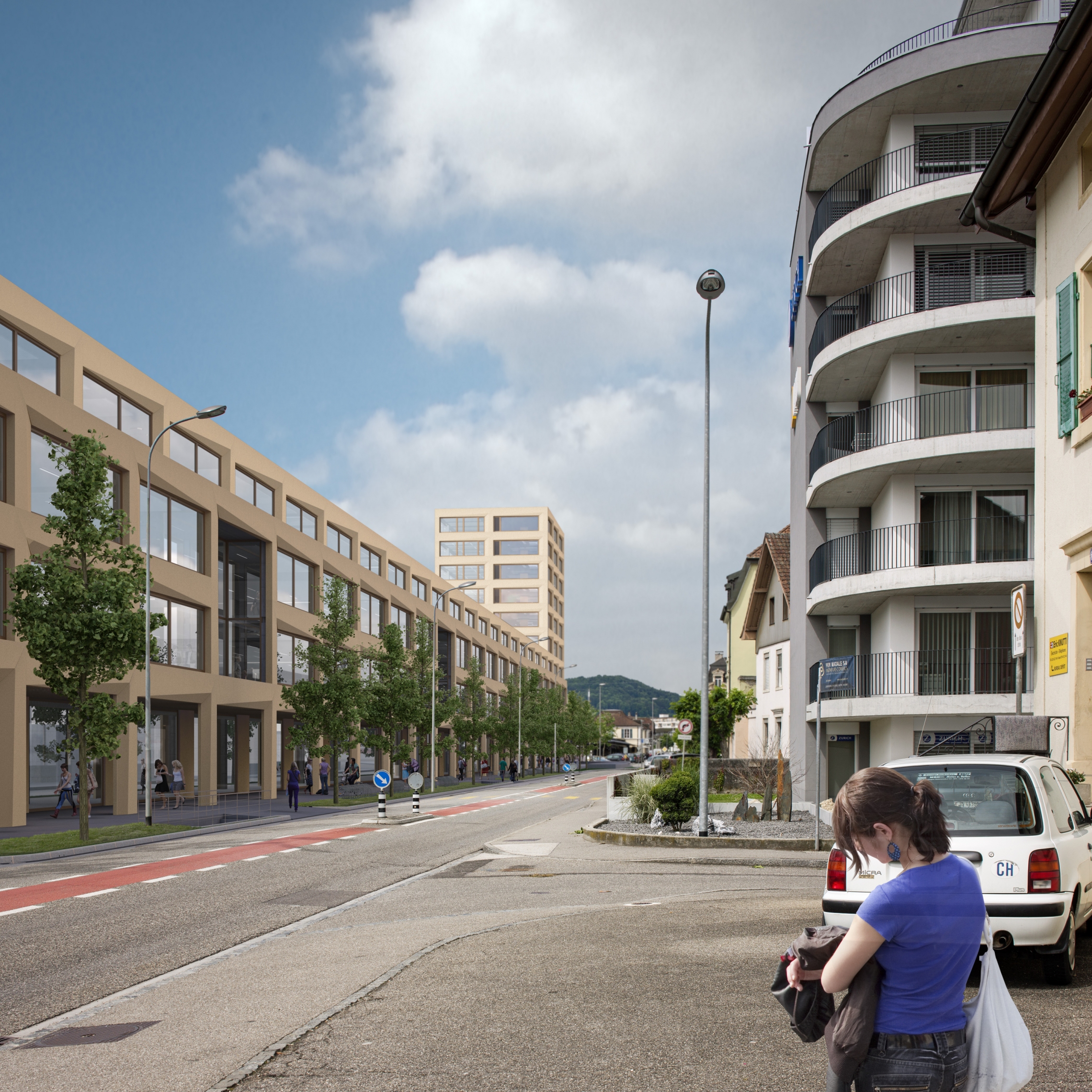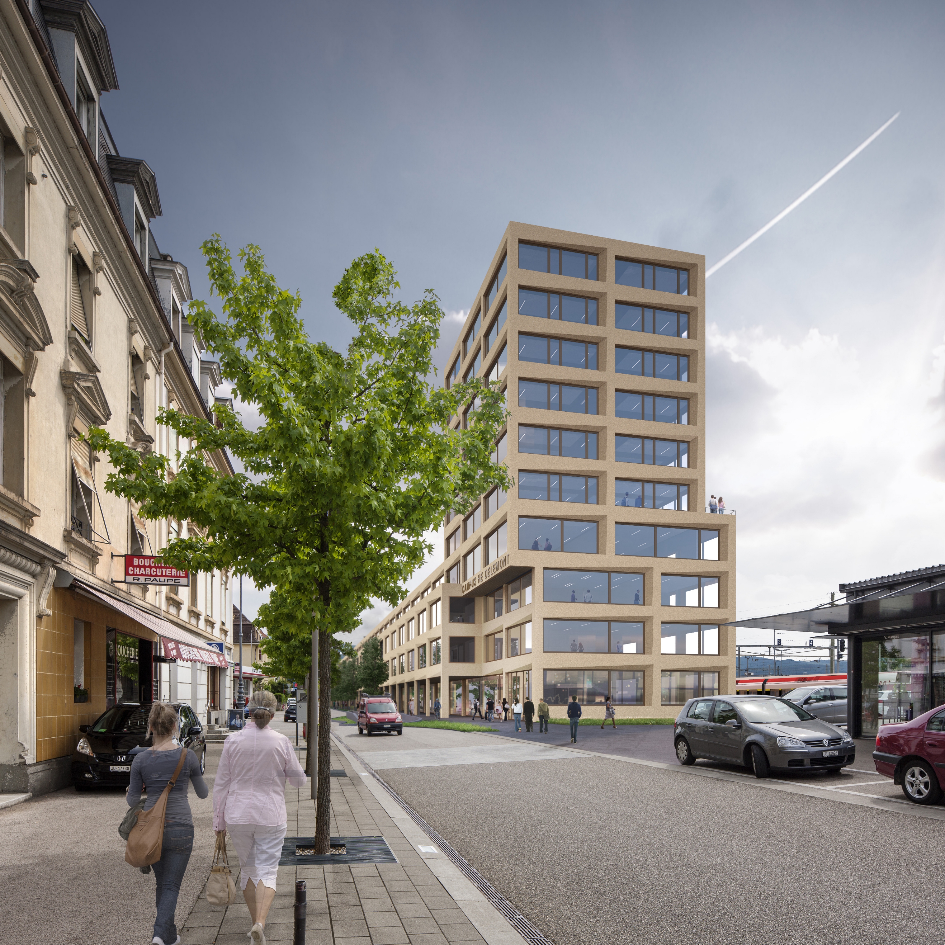 A l’intérieur d’un gabarit urbain pré-défini, le projet cherche une relation forte tout en s’intégrant à l’environnement bâti. La mise en place d’un portique, élément de composition classique de l’architecture, se justifie à cet endroit précis dans la mesure où il donne une première échelle à l’homme par rapport à la grande longueur de l’édifice. Dans le même registre, le retrait d’attique prévu sur la route de Moutier participe à l’adaptation au quartier du dix-neuvième siècle.
