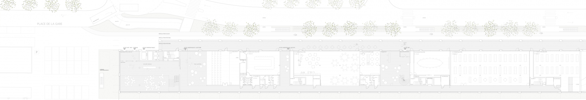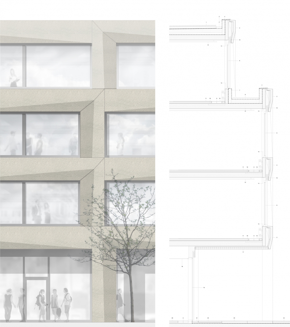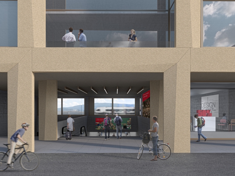 Le principe constructif se veut simple et efficient. Il répond aux demandes de flexibilité du Maître d’ouvrage et à la planification très serrée de la phase de réalisation. Le sous-sol est excavé avec une enceinte de fouille de type paroi berlinoise périphérique afin d’assurer la stabilité des domaines ferroviaires et routiers. La structure est ponctuelle depuis les soussols avec des noyaux de circulation qui reprennent le contreventement et les efforts liés aux contraintes para-sismiques. La structure est entièrement conçue en béton armé, ce matériau possédant toutes les caractéristiques de durabilité, de résistance au feu et au bruit, tout en étant écologiquement et économiquement intéressant.