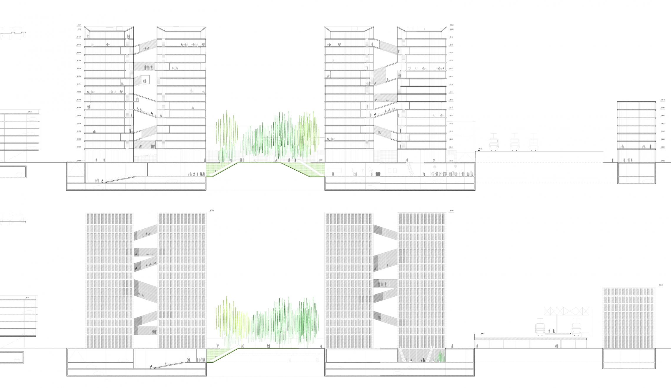 A la sortie de ce dernier, le rez-de-chaussée du bâtiment 'L14' est presqu’entièrement évidé afin de donner la continuité de l’axe piétonnier depuis la future place de la Gare. Le passage sous le CEVA s’effectue par une large galerie hypostyle où les montées vers les voies sont mises en évidence. Le parcours se poursuit entre les nouveaux bâtiments au pied desquels s’installent les commerces et les différents accès vers le haut (bureaux dans les étages), mais aussi vers le bas (cinémas et parkings au sous-sol). Pour amorcer le passage difficile de la route des Jeunes, sans mettre en jeu la démolition du P+R de l’Etoile, le rez-de-chaussée de ce dernier est aussi vidé (discothèque déplacée dans le complexe) pour permettre une grande ouverture, à l’échelle de l’homme, face au gigantisme de la future place de l’Etoile. Le parcours se poursuit dans l’avenue de la Praille vers l’Arve. Une traversée de la ville de rivière à rivière.