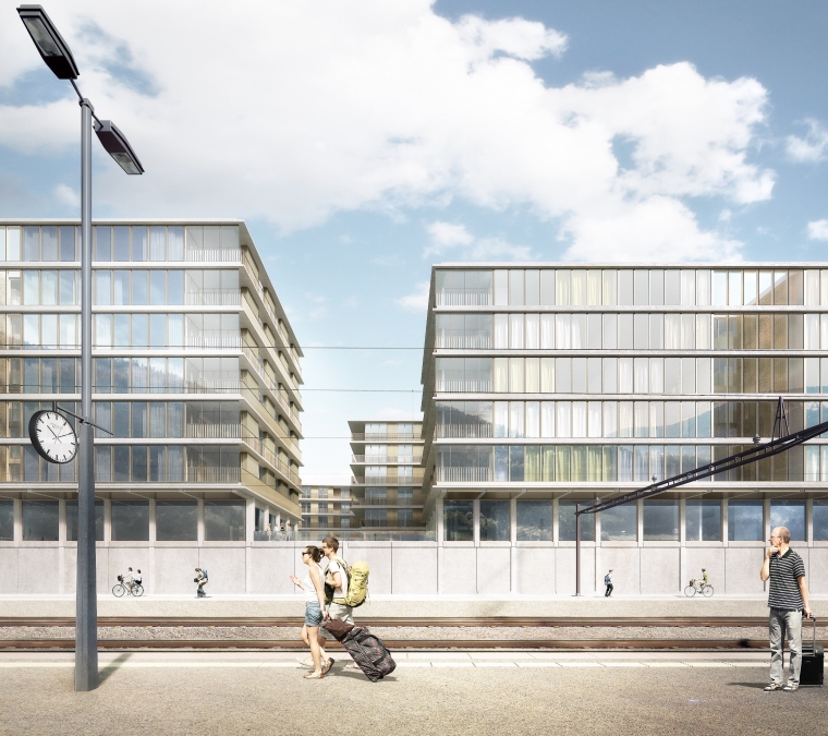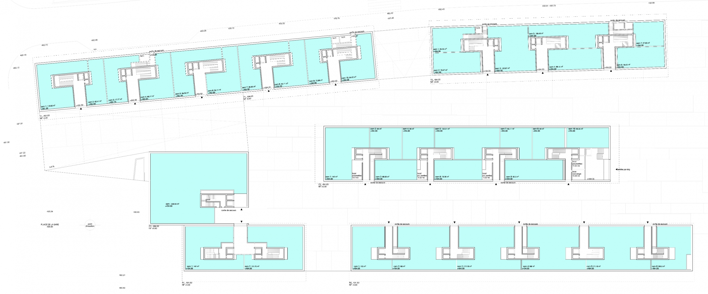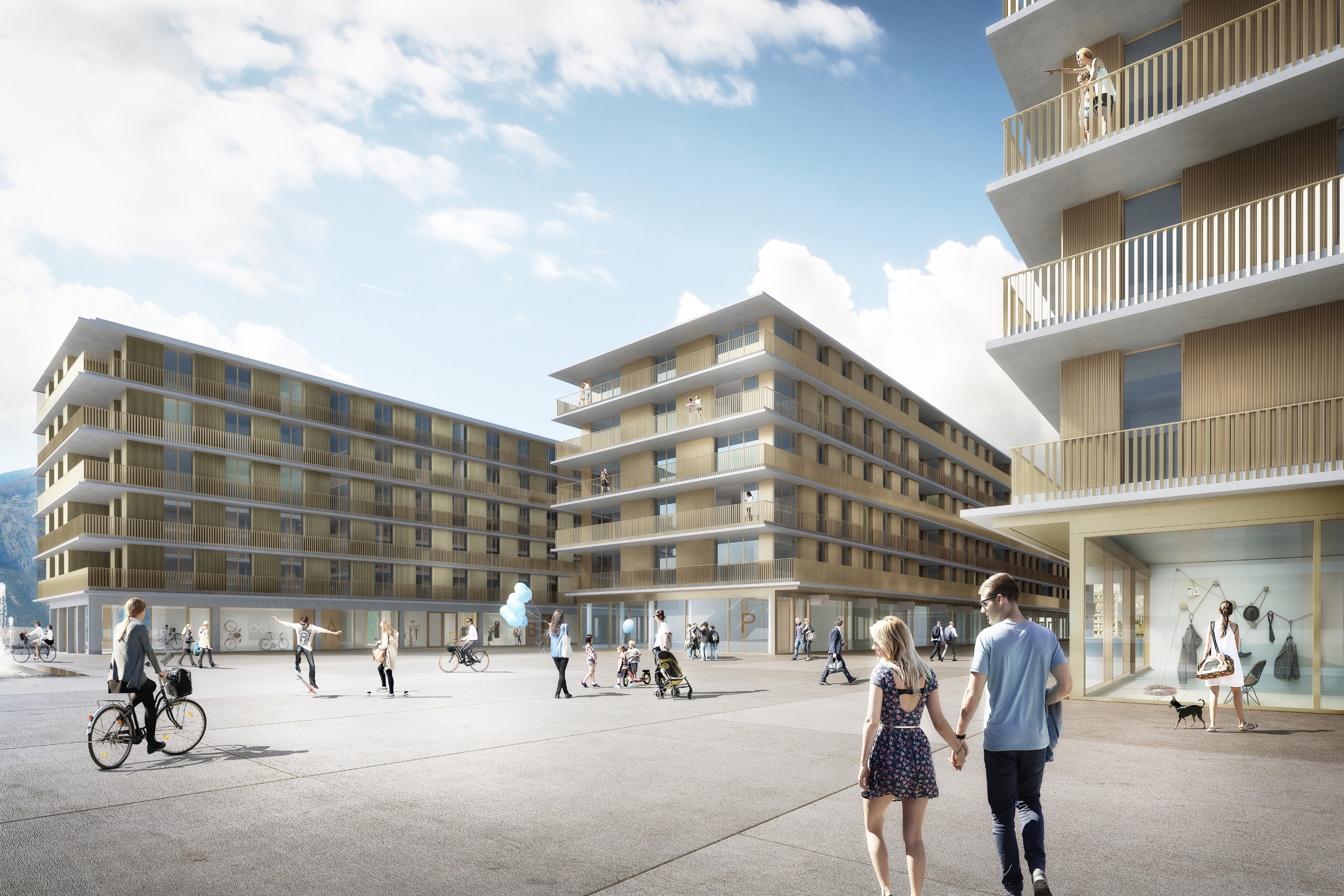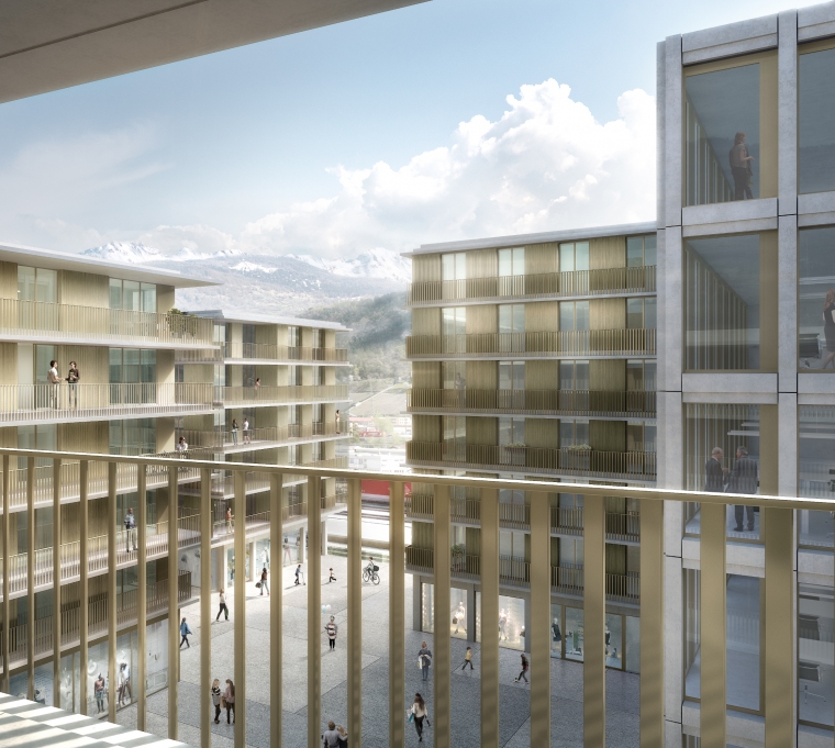 Basé sur un plan de quartier issu du mandat d’études parallèles pour lequel l’agence maa fut finaliste en 2012, le projet comprend une série de six bâtiments dont la plupart sont destinés aux logements collectifs. Implantés sur un rez-de-chaussée artificiel - comprenant deux niveaux de parking pour un total de plus de six cent places - les volumes offrent une grande surface commerciale en rapport avec la gare et le bas de la ville de Sion.
