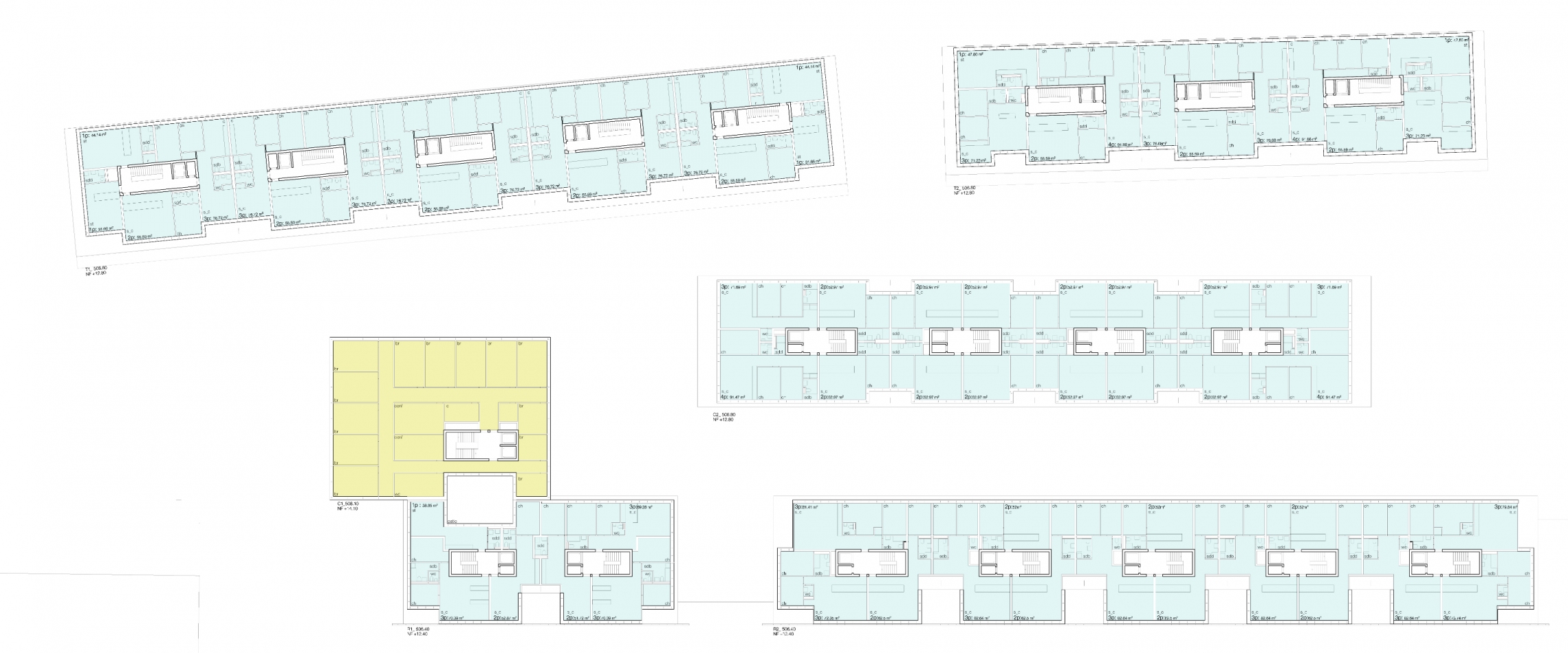 La mise en place typologique a dû prendre en considération les contraintes de la parcelle. Les quelques trois-cents appartements proposent des espaces domestiques s’adaptant à la morphologie et aux impositions normatives: des logements traversants, des logements d’angle ou des logements disposés autour de patios verticaux protégeant du risque ferroviaire.