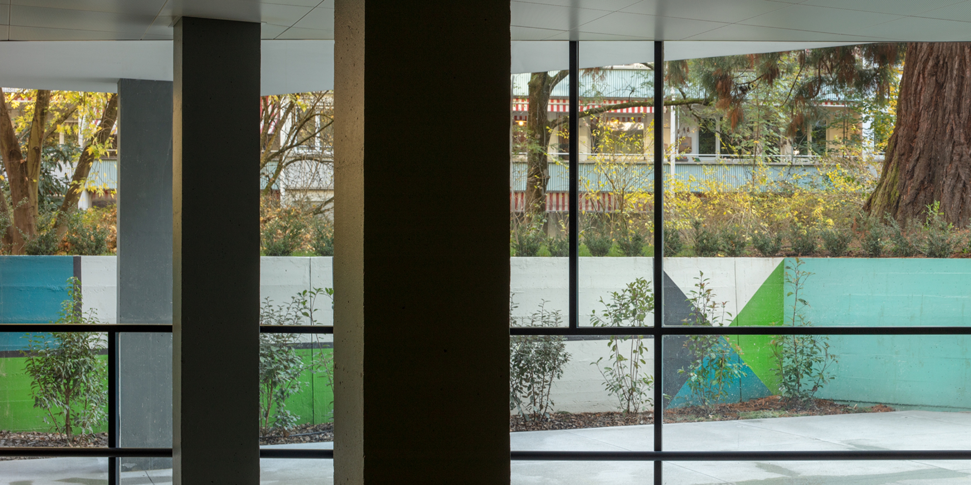 par un hall allongé et vitré. Ce dernier est cependant situé