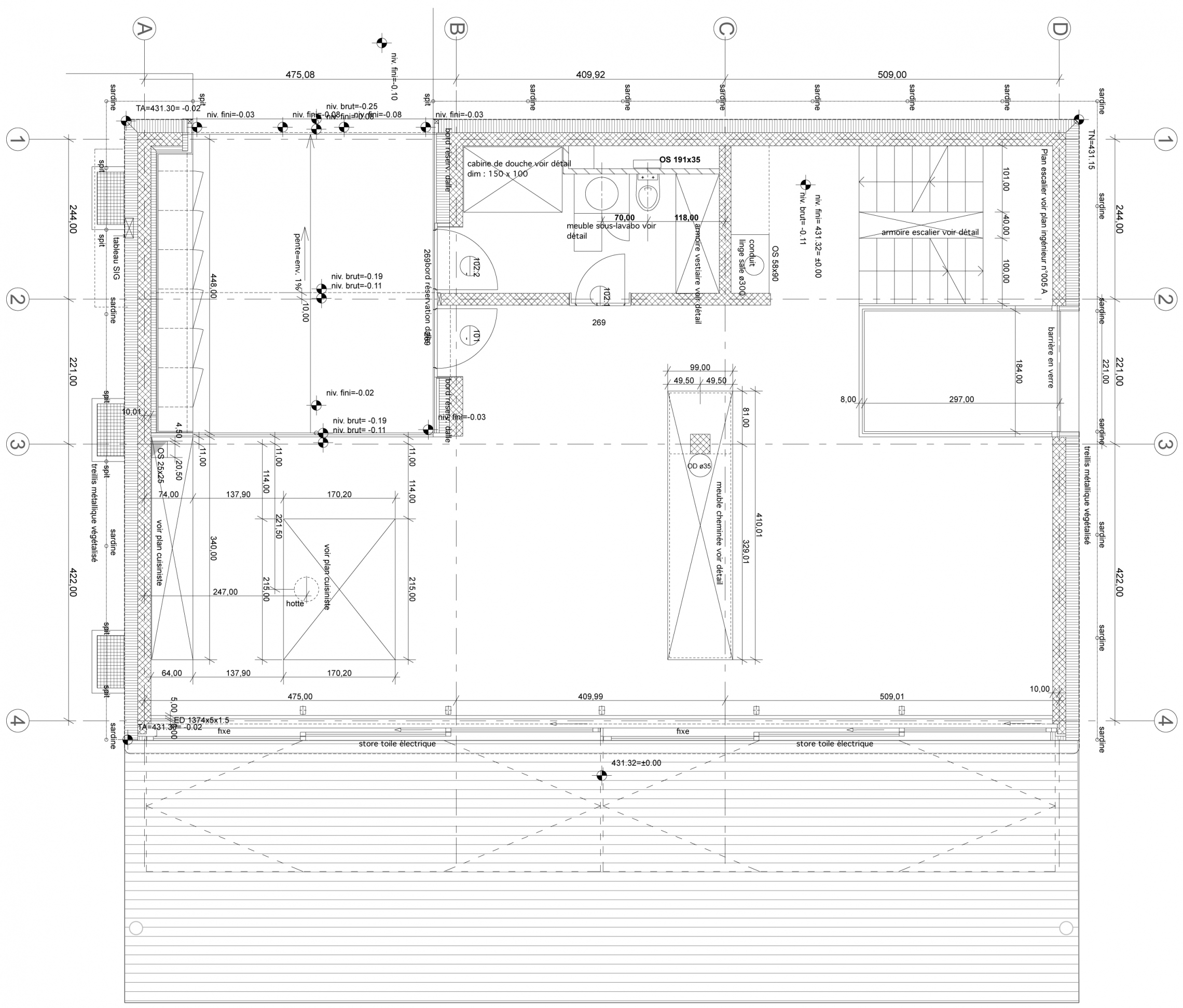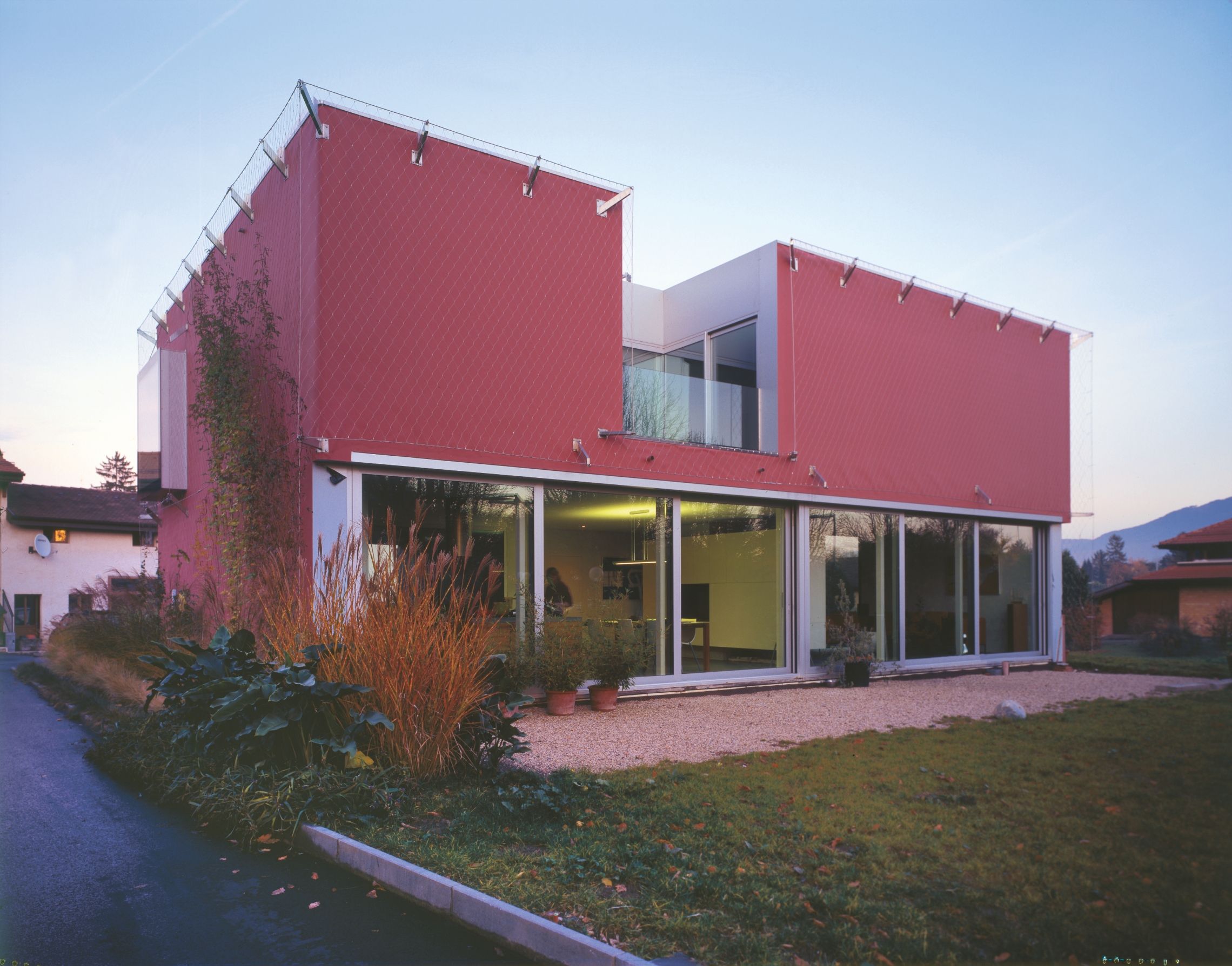 La villa est végétalisée afin de répondre à la situation particulière du lieu et pour rendre compte de la situation professionnelle du Maître d’ouvrage qui exploite la terre agricole dans la région. Un grillage en fils d’acier inoxydable est tendu en avant de la peau thermique et sert de support aux plantations grimpantes.