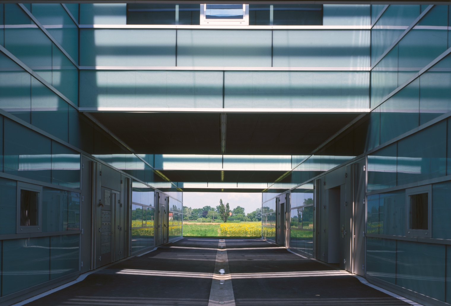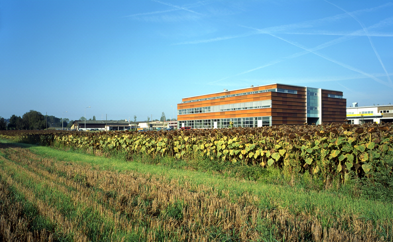 Le projet s’inscrit dans une nouvelle zone artisanale et industrielle et se base sur un plan directeur. Le concept d’implantation met en place une distribution claire des personnes et des marchandises, en mettant l’accent sur la facilité d’accès des véhicules, au moyen d’une rue intérieure, partiellement à ciel ouvert, qui offre un regard sur le paysage agricole environnant.