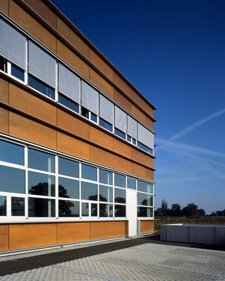 Les façades expriment à travers des lignes horizontales en aluminium, la règle dimensionnelle du projet : sur l’extérieur la peau est réalisée en panneaux contreplaqués Méranti, inscrits dans des profilés ; sur la rue intérieure elle est composée de vitrages translucides et d’éléments ouvrants en verre transparent. Les trois cours à ciel ouvert sont couronnées par des éléments de brise soleil en aluminium qui découpent l’azur en de fines striures géométriques.