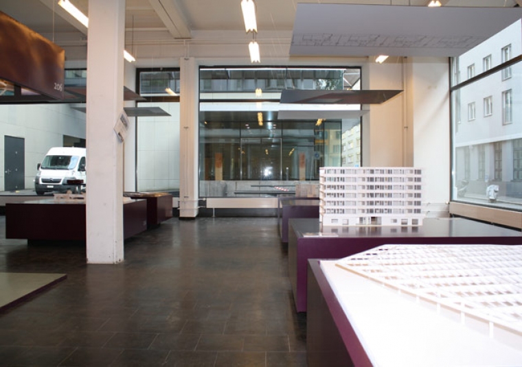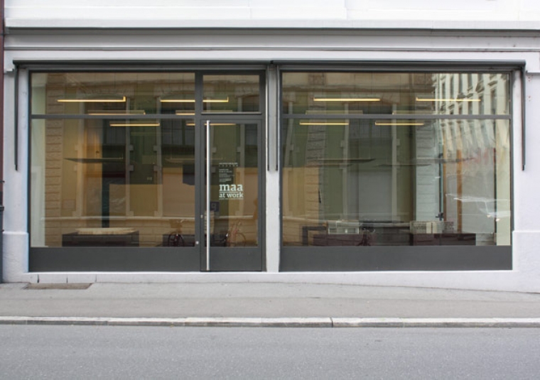 l’exposition ‘maa at work’ prend possession de l’Architekturgalerie à Lucerne. dans ce lieu au centre de la ville, les blocs de couleurs qui supportent les maquettes et les illustrations des projets de l’agence sont présentées sous forme d’un alignement en damier régulier.