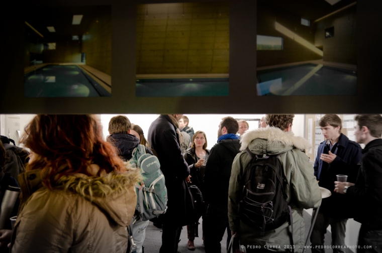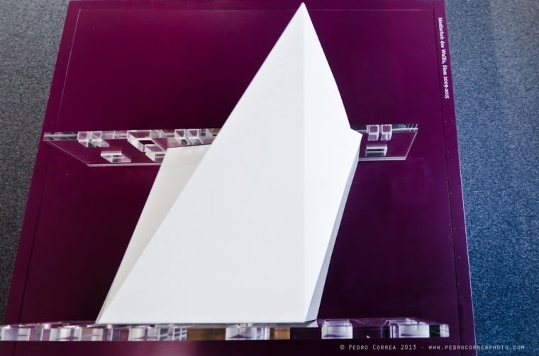 l’exposition se déroule sur le site loci de bruxelles, dans le quartier de saint-gilles. le bâtiment est occupé sur plusieurs étages par l’exposition ‘maa at work’. une grande affiche se déroule sur quatre niveaux dans la cour couverte de l’école d’architecture. les maquettes et les illustrations des projets de l’agence sont présentées dans leurs supports d’origine.