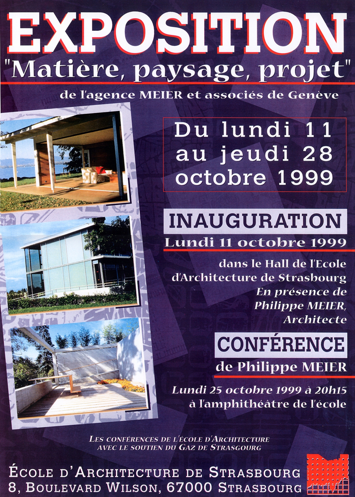 L'exposition s'est déroulée du 11 au 28 octobre 1999, dans le hall de l'Ecole d'architecture de Strasbourg. L'exposition est divisée en trois parties: les 'photographies' qui présentent la partie construite des travaux de l'agence, les 'orthographies', redessins à la même échelle de onze projets de concours et les 'scénographies' qui rassemblent maquettes et perspectives.